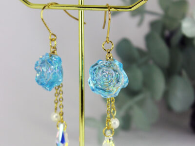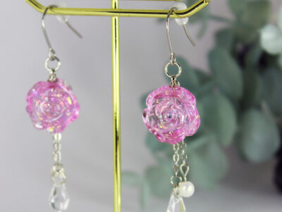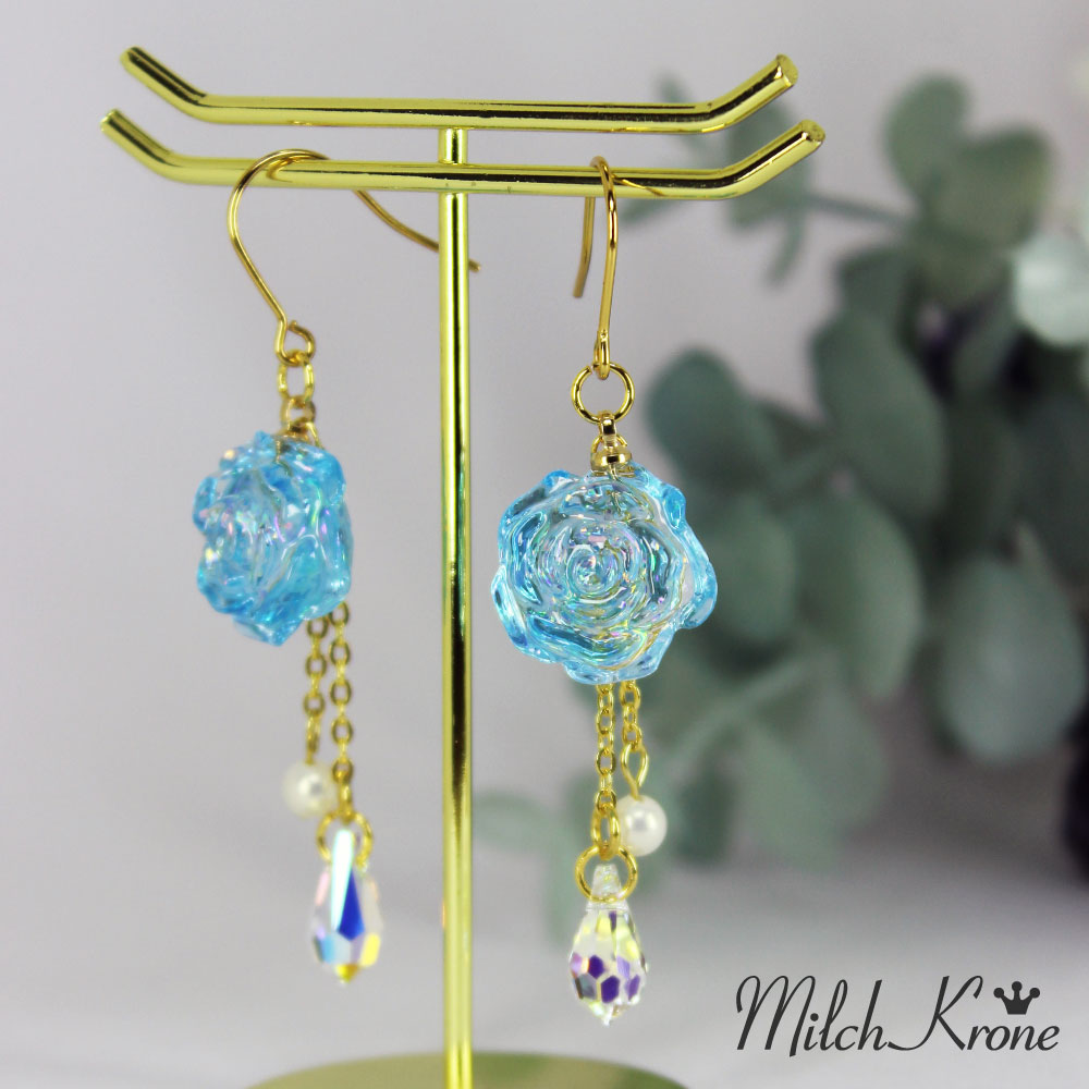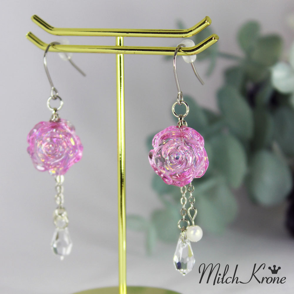 小さな薔薇のチャームに乱切りホロを詰め込み、ドロップビーズやパールが揺れるピアスに仕上げました。